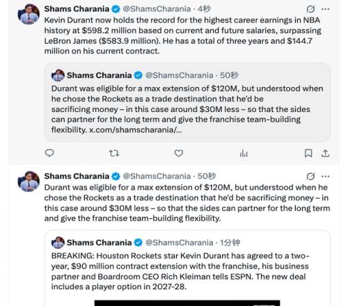 杜兰特本有资格获得一份为期两年、价值1.2亿美元的顶薪续约合同,但他在选择火箭队作为交易目的地时就明白,他将在新合同中牺牲一部分薪水——在这种情况下大约是3000万美元——这样双方可以长期合作,并为球队在阵容建设上提供灵活性。